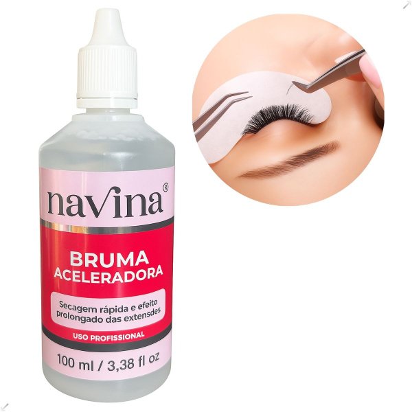 Acelerador de Cola Glue Bruma Navina 100ml - A Bruma Navina é um lançamento no mercado para produtos de pós extensão de cílios, visando melhorar o tempo de retenção das extensões. È um acelerador de cola que funciona como um anti-resíduo, ajudando acelerar a fixação dos fios garantindo uma secagem rápida e um efeito prolongado, aplicada corretamente promove maior retenção dos fios.
