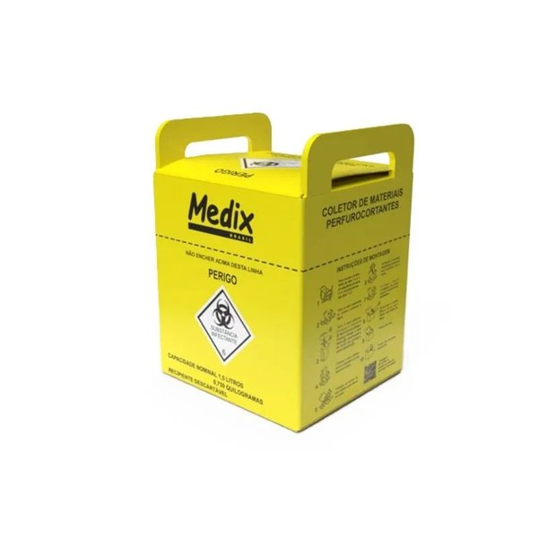 Recipiente para perfurocortante/infectante, desenvolvido para coleta, armazenamento e descarte de material perfurocortante potencialmente infectante.